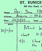 (a) Transported by ambulance from accident scene(3) His wife was summoned to the Federal Medical Center in Boromyuo, the second stop in his whirlwind tour. Was she with him when he had his accident in the Mercedes? Or did she have to travel 1 1/2 to 2 hours from her home in Ontisha? In either case, why was this not mentioned?(b) to Federal Medical Center in Boromyuo. Then after Dan Eke protested and said he wanted to be taken to his hometown hospital he was granted this insane request in his alleged condition