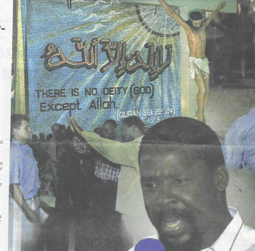 UPDATE:  Since I posted the above photograph, all elements of which were photographed in the Synagogue, that was clipped from a newspaper article in South Africa, I have since received confirmation of who wrote the article and where it was taken in an e-mail dated 5/11/01. "I am sure you have received the picture where you can see a quatation from the Quaran next to Jesus hanging on the Cross, with the words "There is no Deity but Allah". (I can send it if you want it). It is inside the Synagogue Church.In another e-mail I was informed about the author of the article. "... Prof Tom Gouws ... wrote an article in "Beeld", an Afrikaans newspaper in Johannesburg, in which he in fact EXPOSED Joshua and pointed out that his doctrine is as deceptive as those of Benny Hinn, Rick Joyner, and others! What the above photo shows is that The Synagogue, Church Of All Nations is an interfaith church.  Also, lest we forget, the Quaran states that Allah has no son, therefore this display in the Synagogue cancels itself out.  The Catholic crucifix alongside a wall hanging with a quote from the Quaran shows an incredible ignorance on the part of T.B. Joshua of both Islam and Christianity.  It is true that there is only one God, but He is one God in Three Persons ... Father, Son and Holy Spirit.  The "god" of Islam is a false God.  The Quaran also states that "God has no son".  That cancels out both the Son and the Father, as without a Son there is also no Father, and of course no Holy Spirit.  The God of the Muslims and apparently T.B. Joshua is not Almighty God revealed in the Scriptures, not the God of Abraham, Isaac and Jacob, not YHWH, not the only true living Triune God of Christianity.  This denial of the Trinity is just one more proof that T.B. Joshua is a heretic.